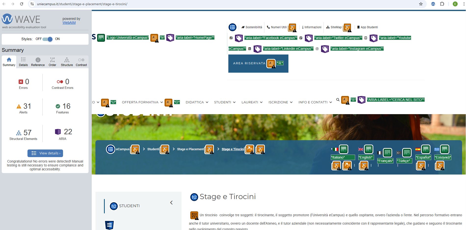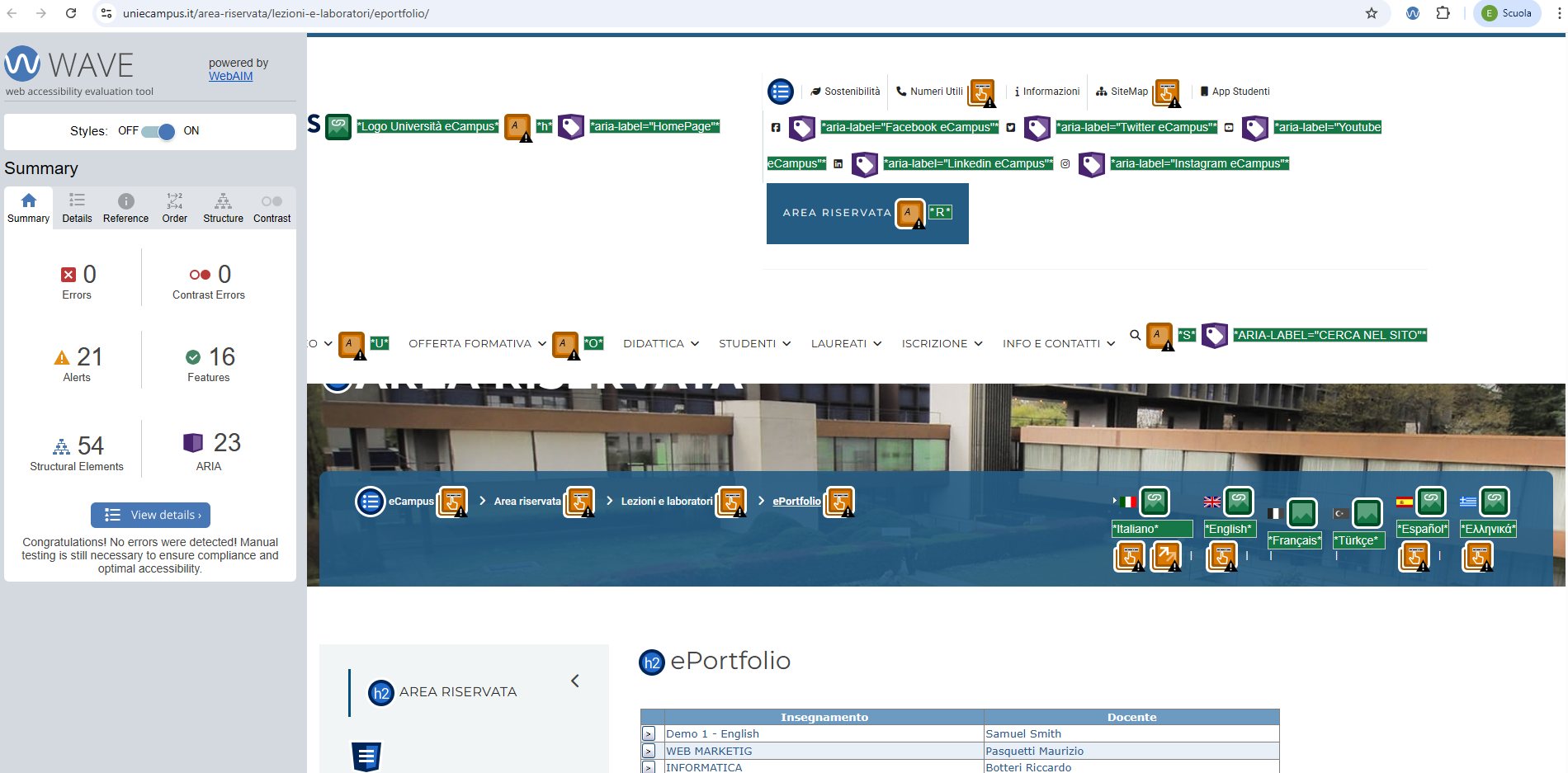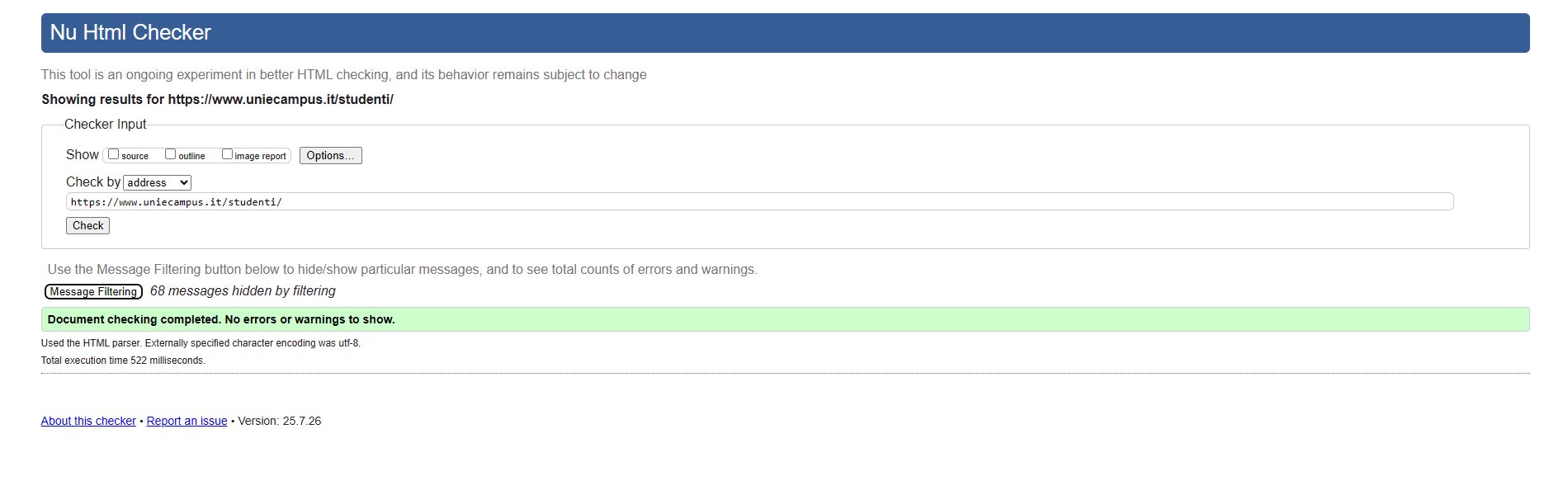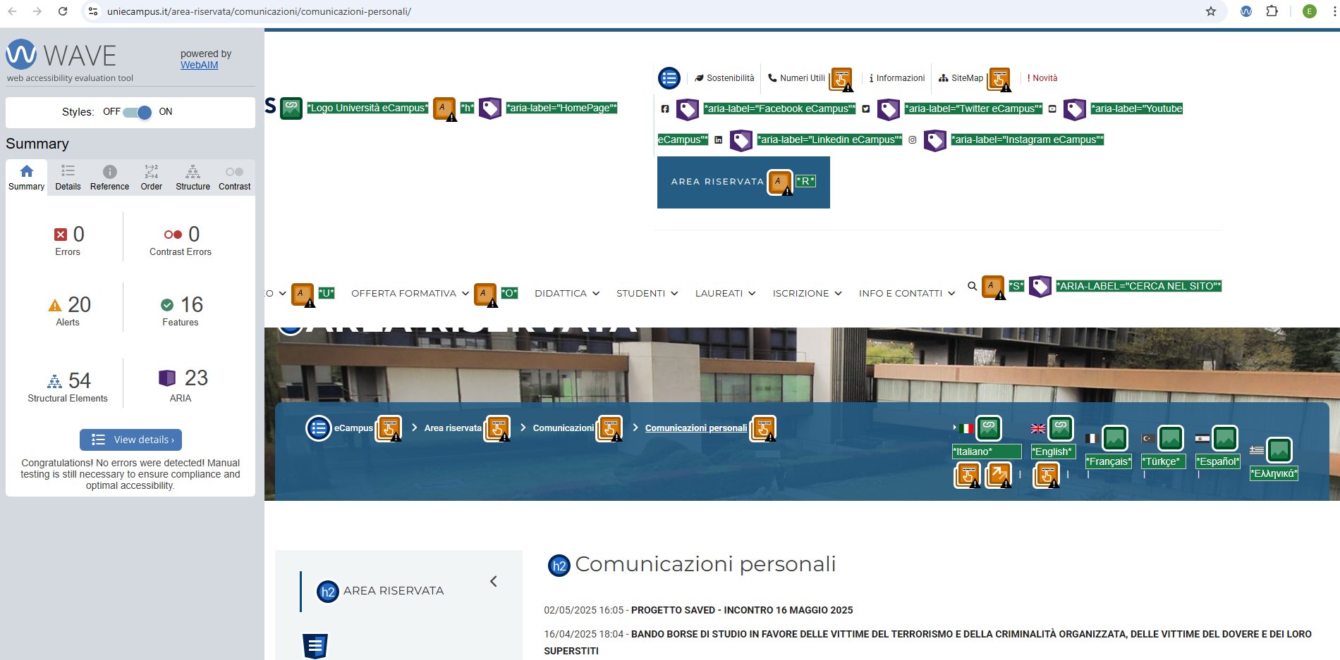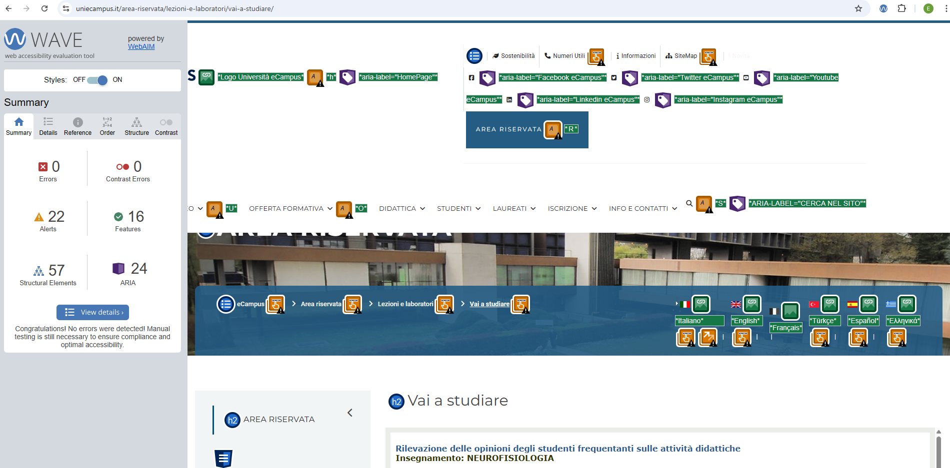 Periodicamente il portale viene sottoposto a test automatizzati di accessibilità e di usabilità (il portale è responsive, quindi fruibile anche da strumenti diversi dallo schermo del computer, quali tablet e smartphone), di cui si possono consultare di seguito i risultati.