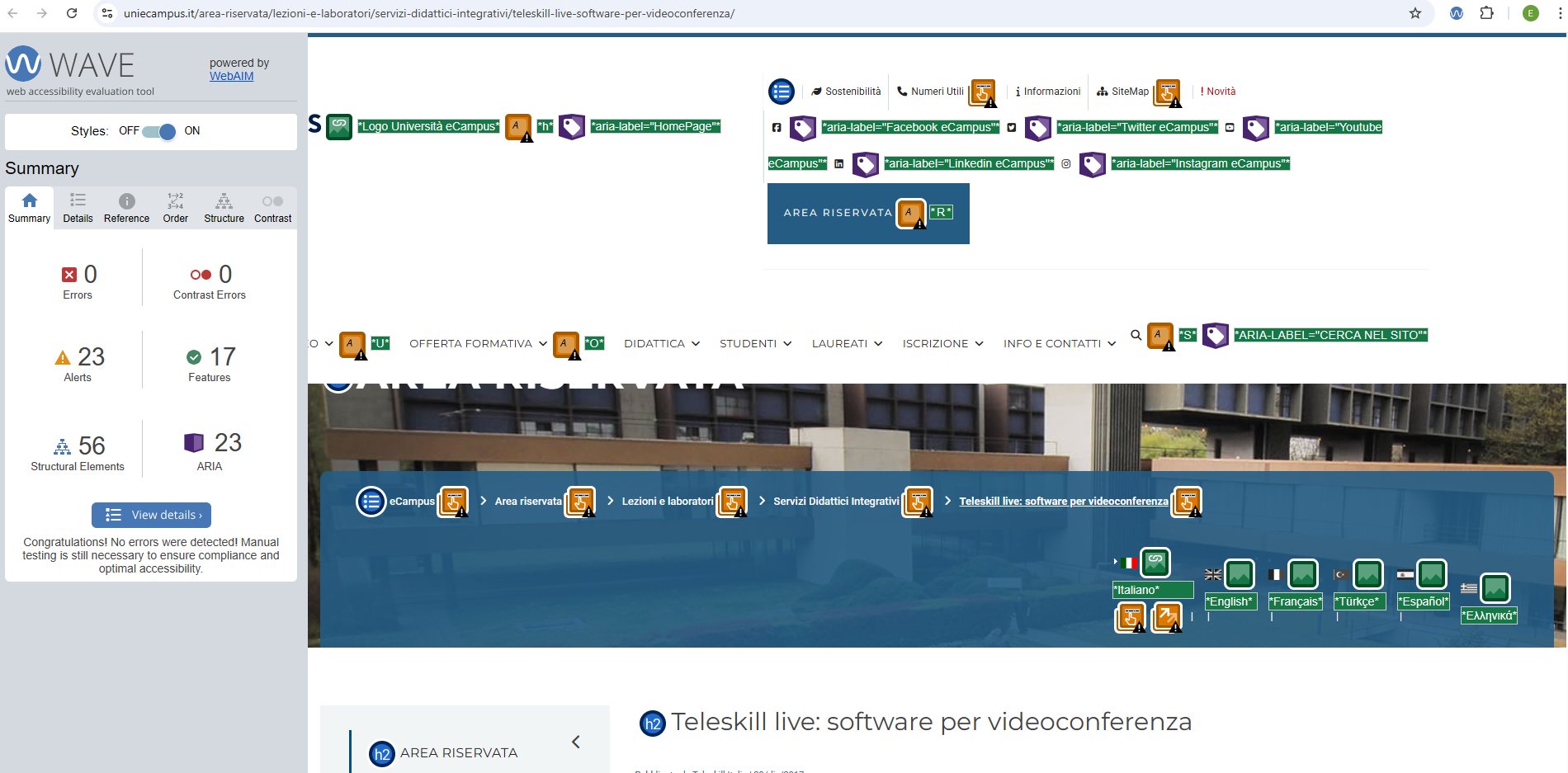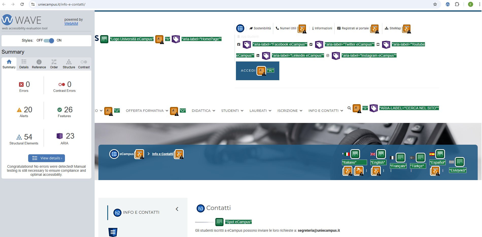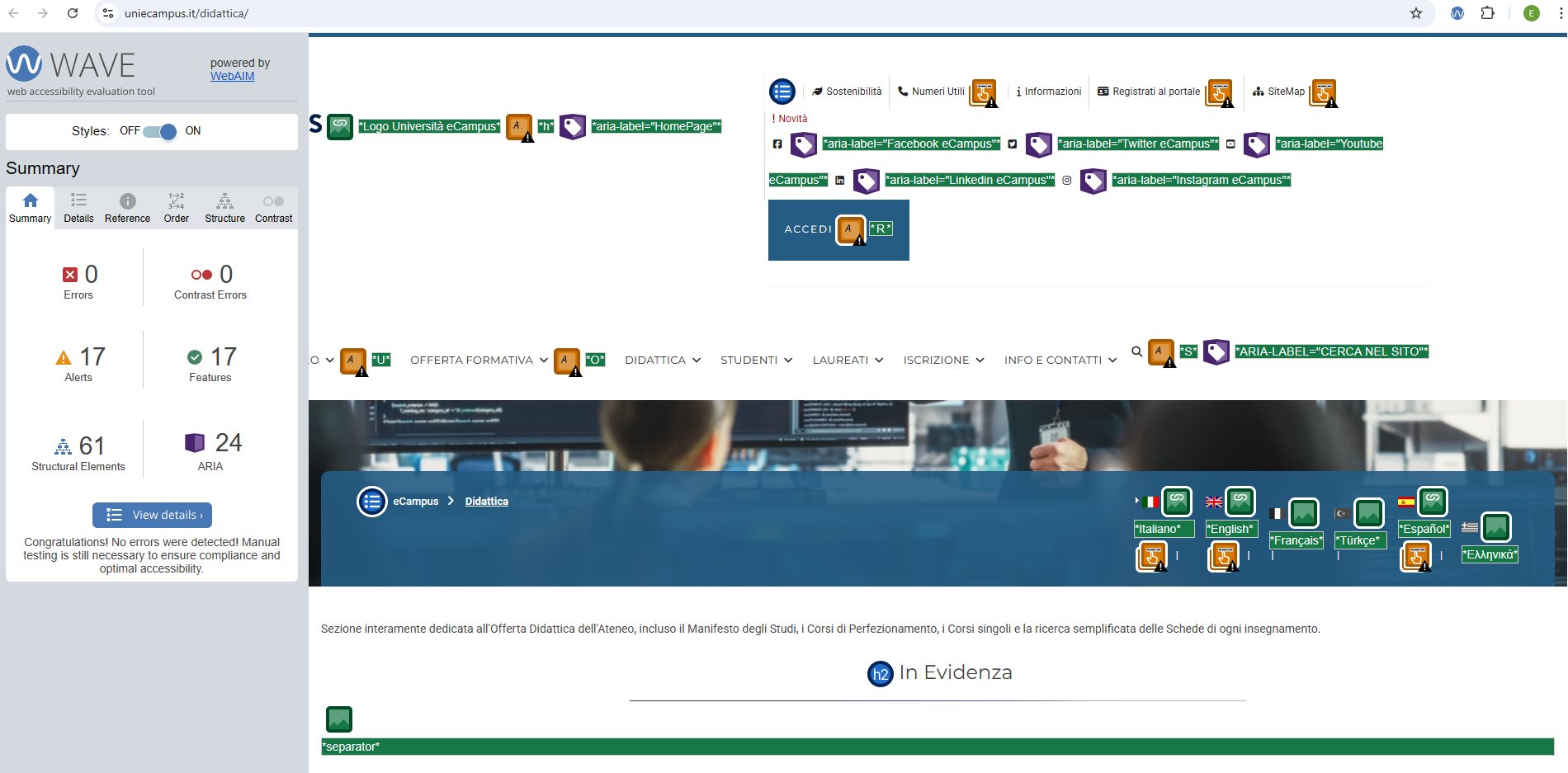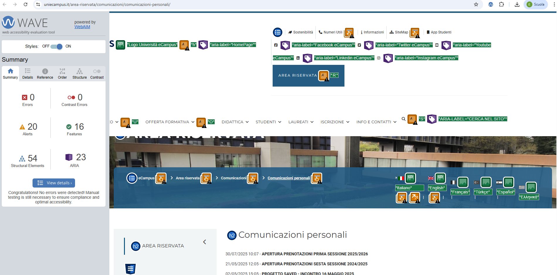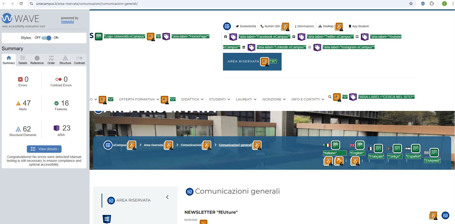Periodicamente il portale viene sottoposto a test automatizzati di accessibilità e di usabilità (il portale è responsive, quindi fruibile anche da strumenti diversi dallo schermo del computer, quali tablet e smartphone), di cui si possono consultare di seguito i risultati.