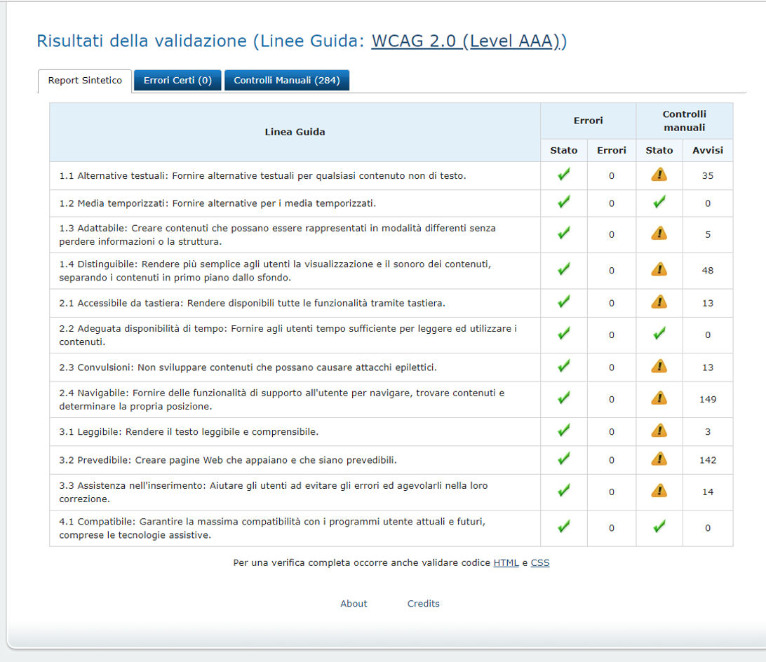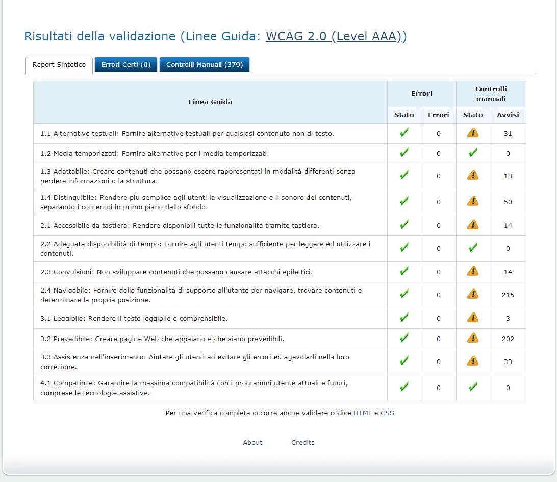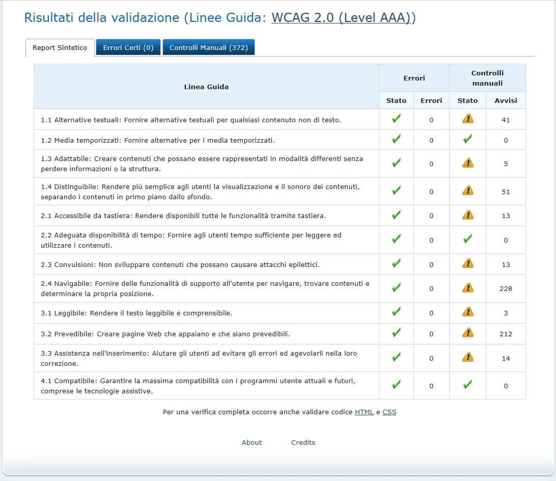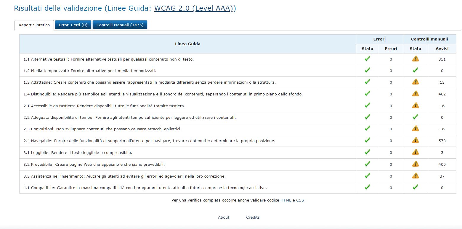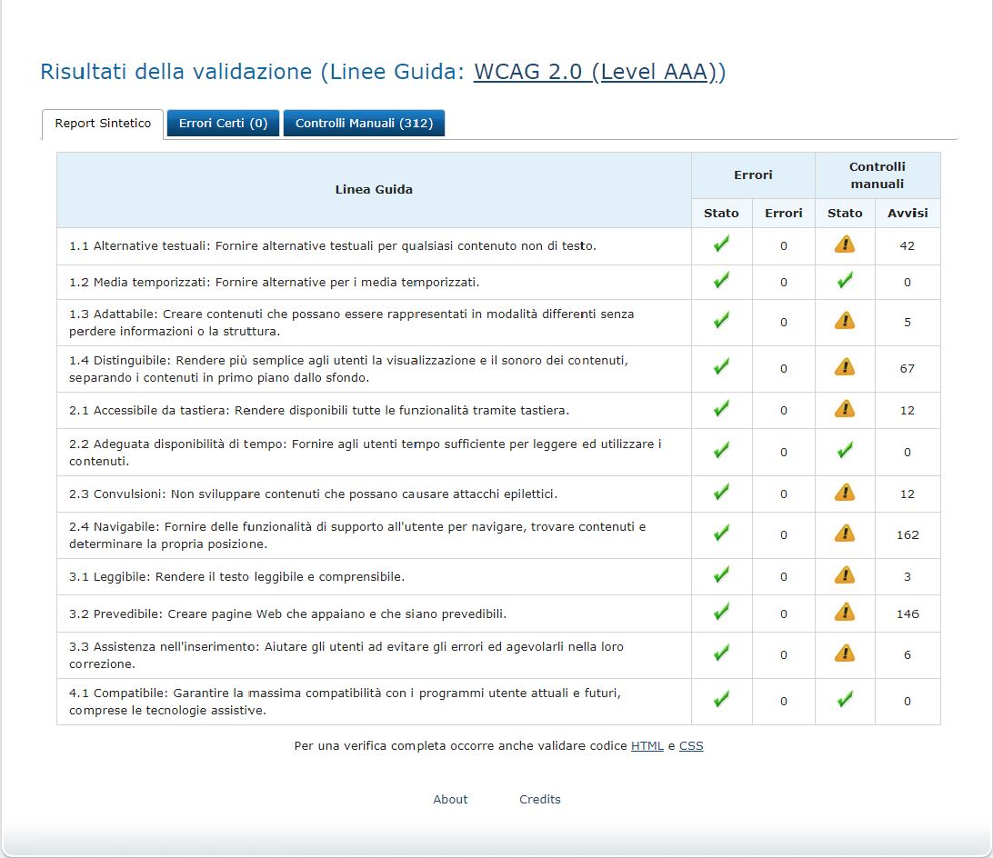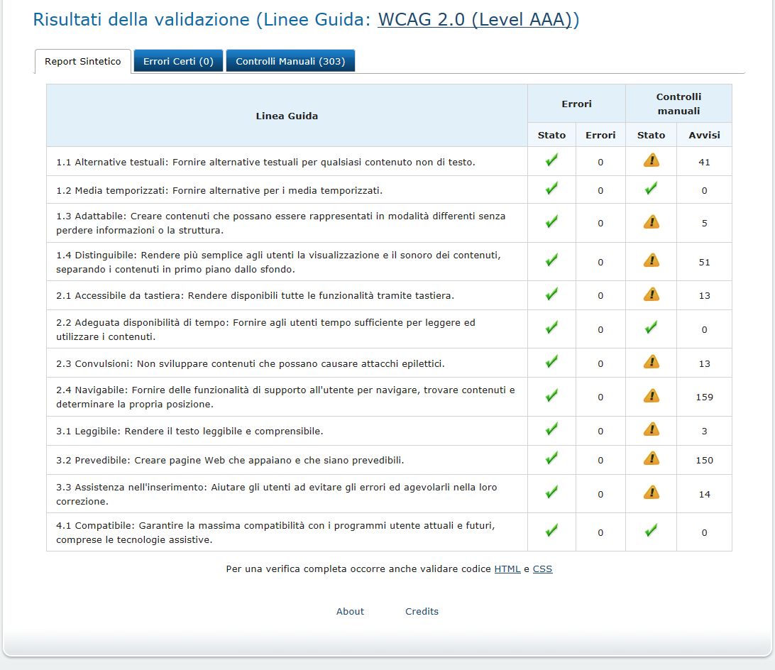 Periodicamente il portale viene sottoposto a test automatizzati di accessibilità e di usabilità (il portale è responsive, quindi fruibile anche da strumenti diversi dallo schermo del computer, quali tablet e smartphone), di cui si possono consultare di seguito i risultati.