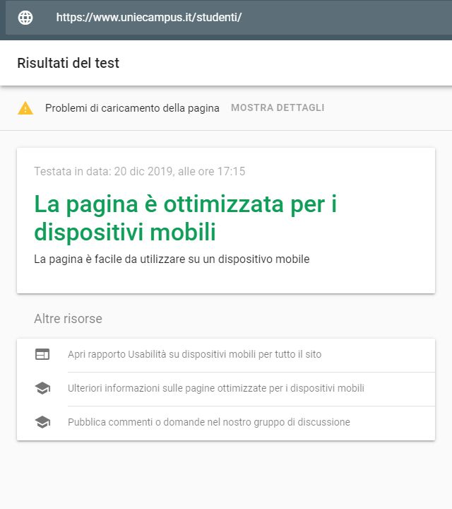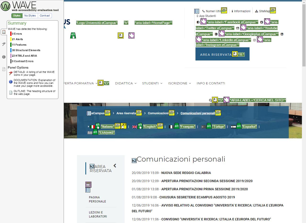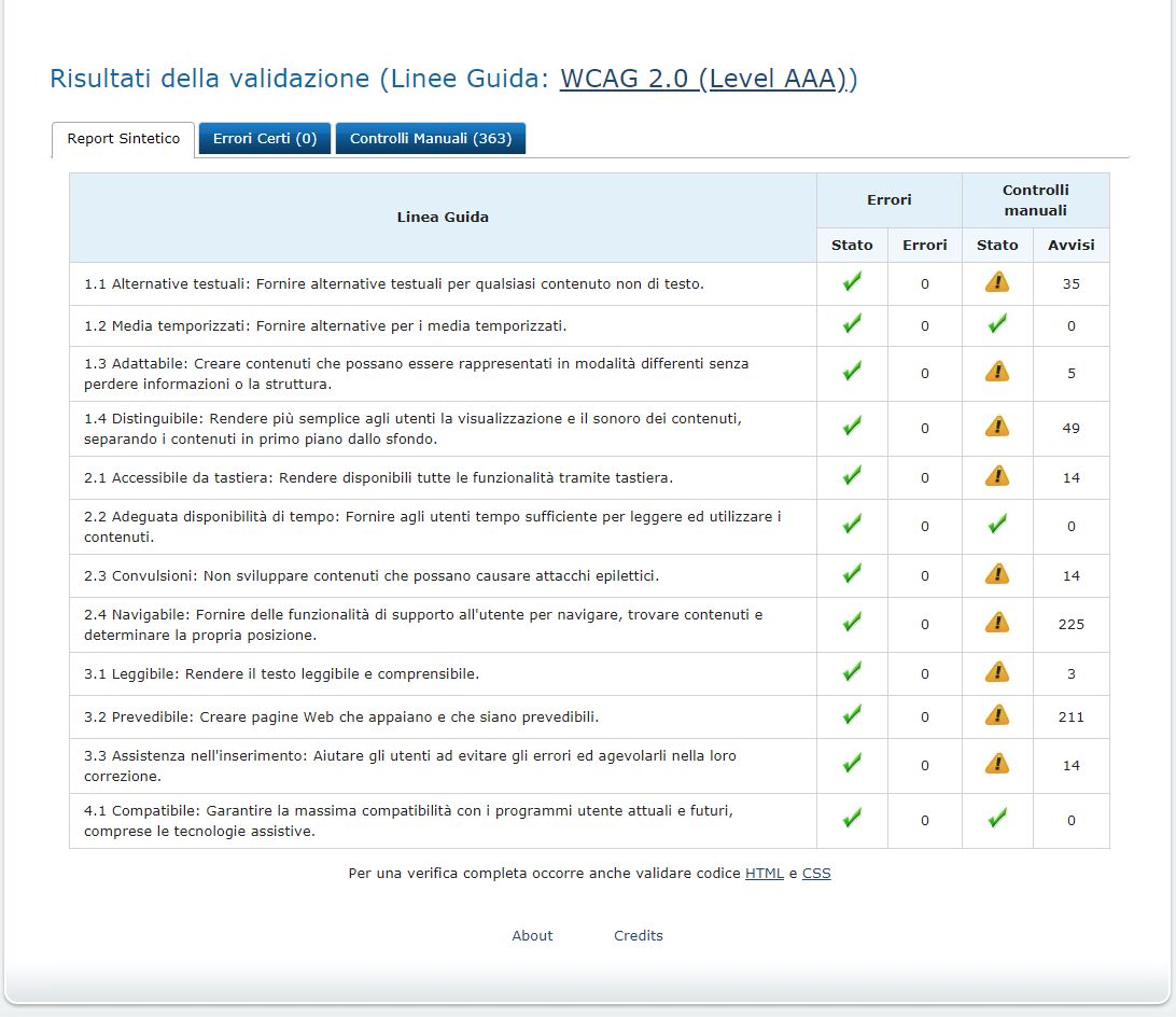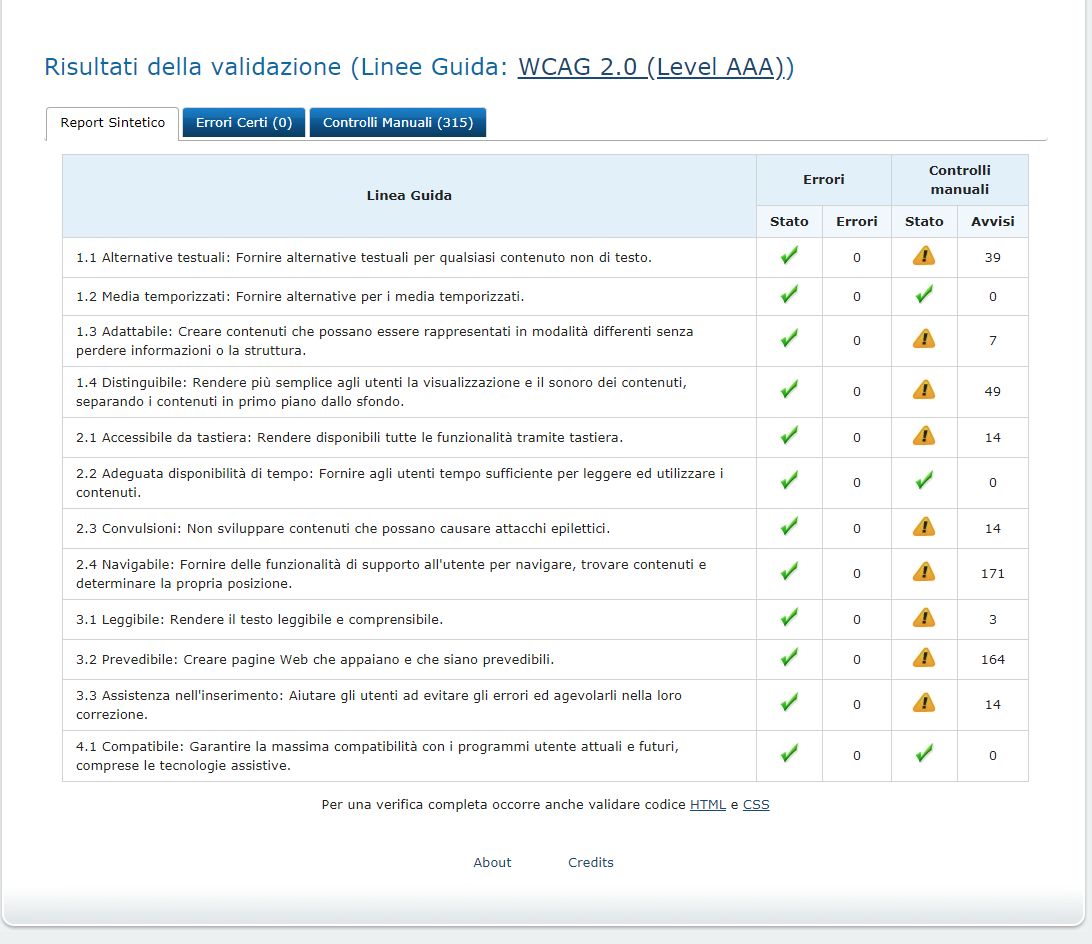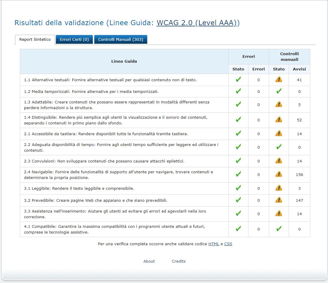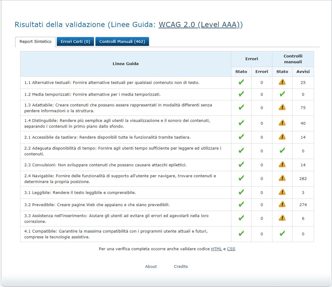Periodicamente il portale viene sottoposto a test automatizzati di accessibilità e di usabilità (il portale è responsive, quindi fruibile anche da strumenti diversi dallo schermo del computer, quali tablet e smartphone), di cui si possono consultare di seguito i risultati.
