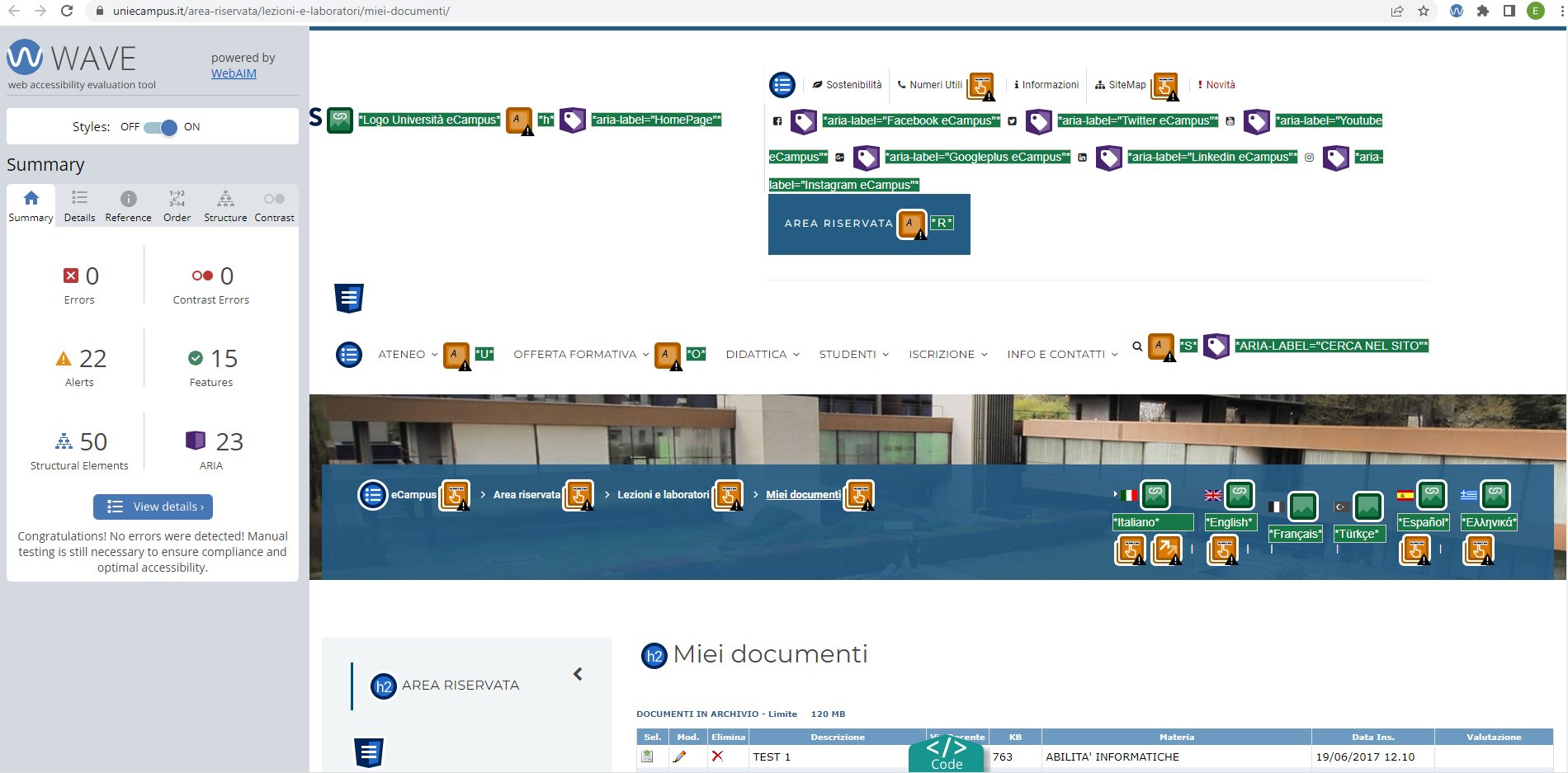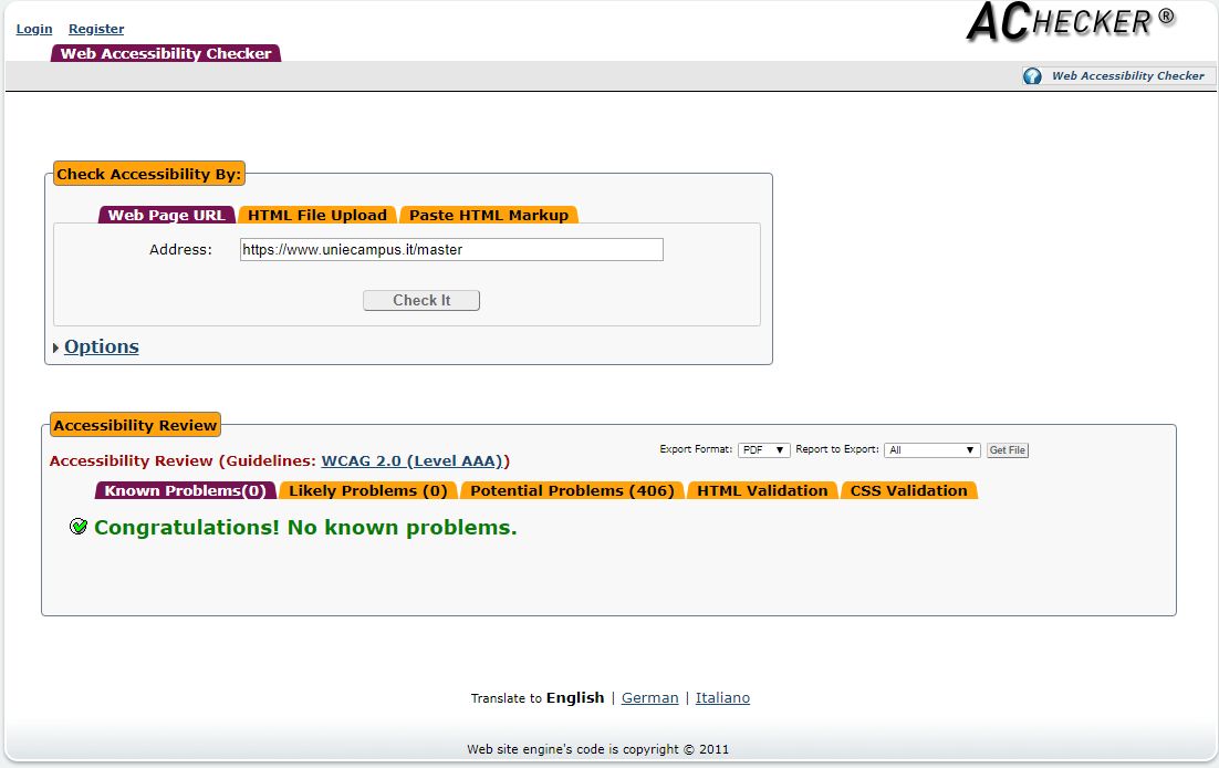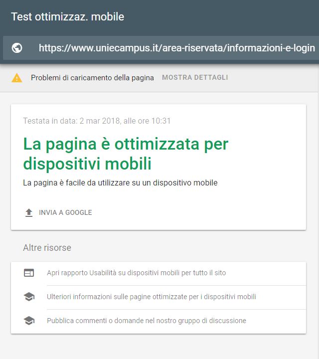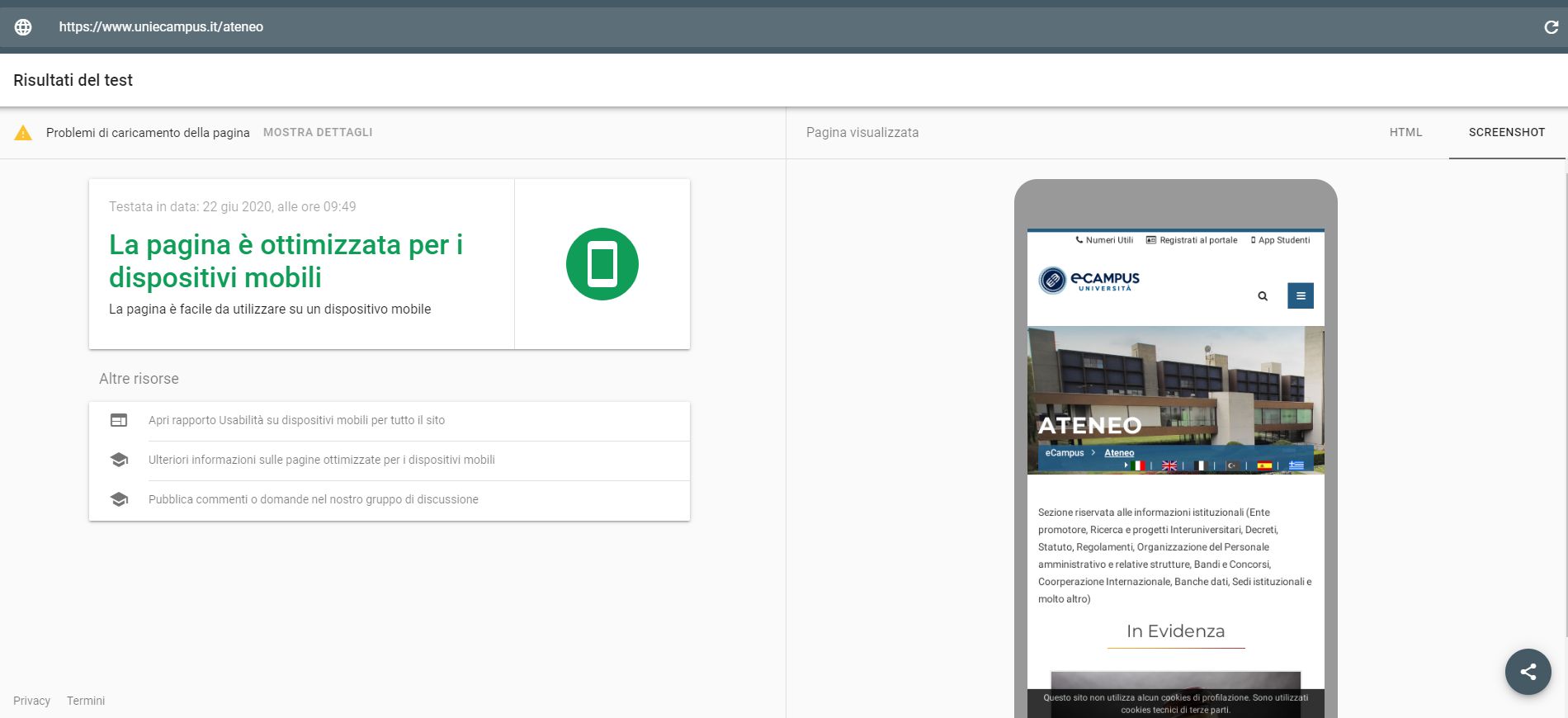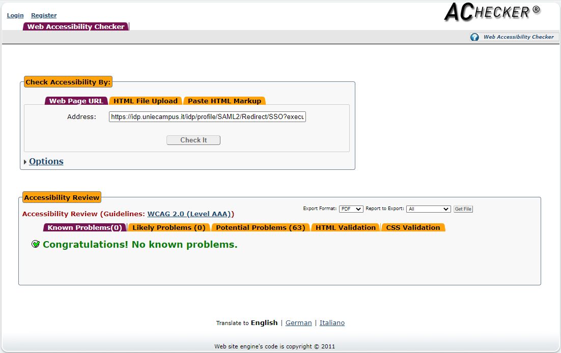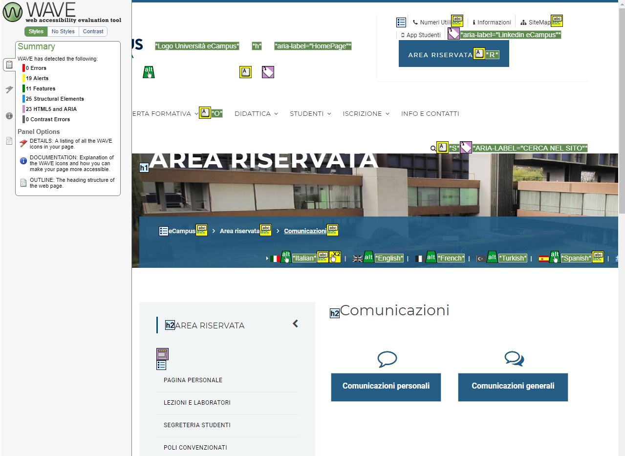 Periodicamente il portale viene sottoposto a test automatizzati di accessibilità e di usabilità (il portale è responsive, quindi fruibile anche da strumenti diversi dallo schermo del computer, quali tablet e smartphone), di cui si possono consultare di seguito i risultati.