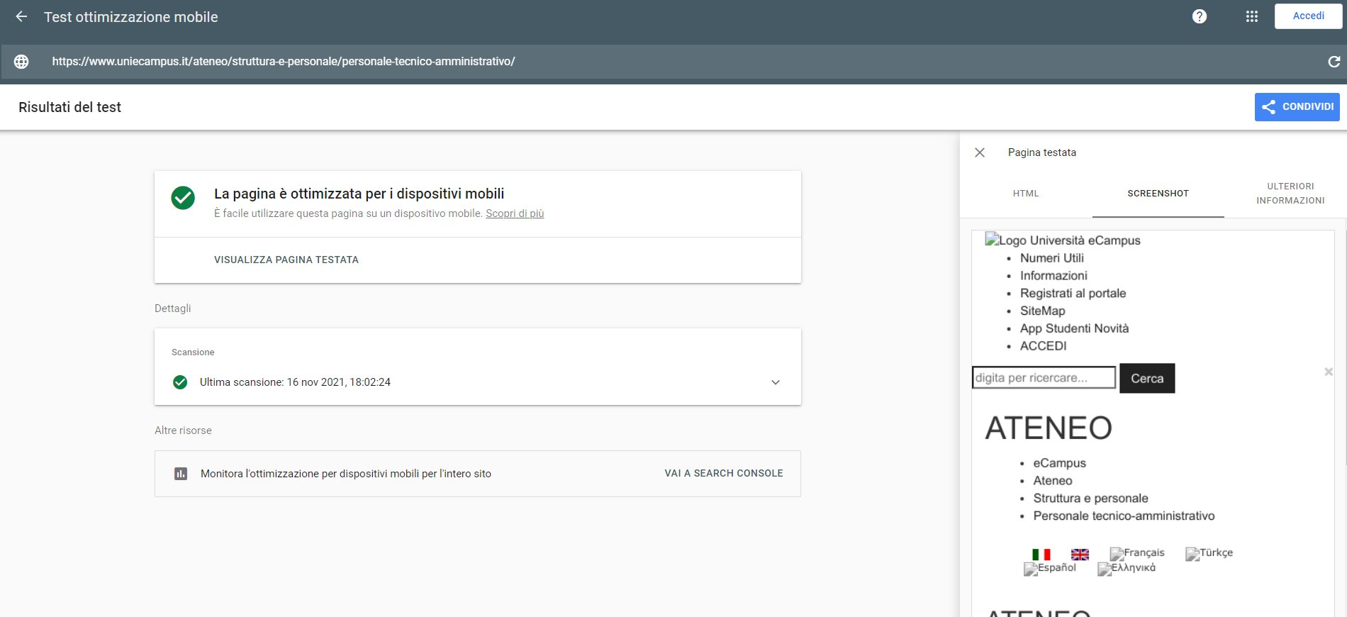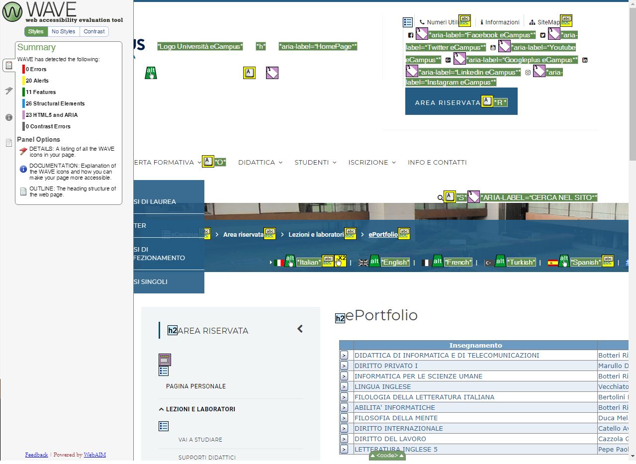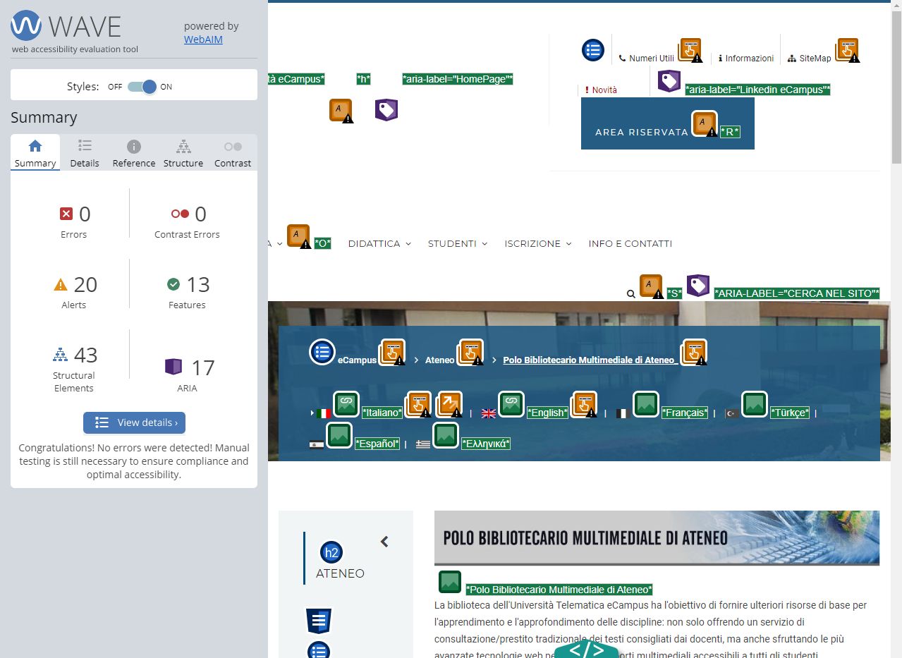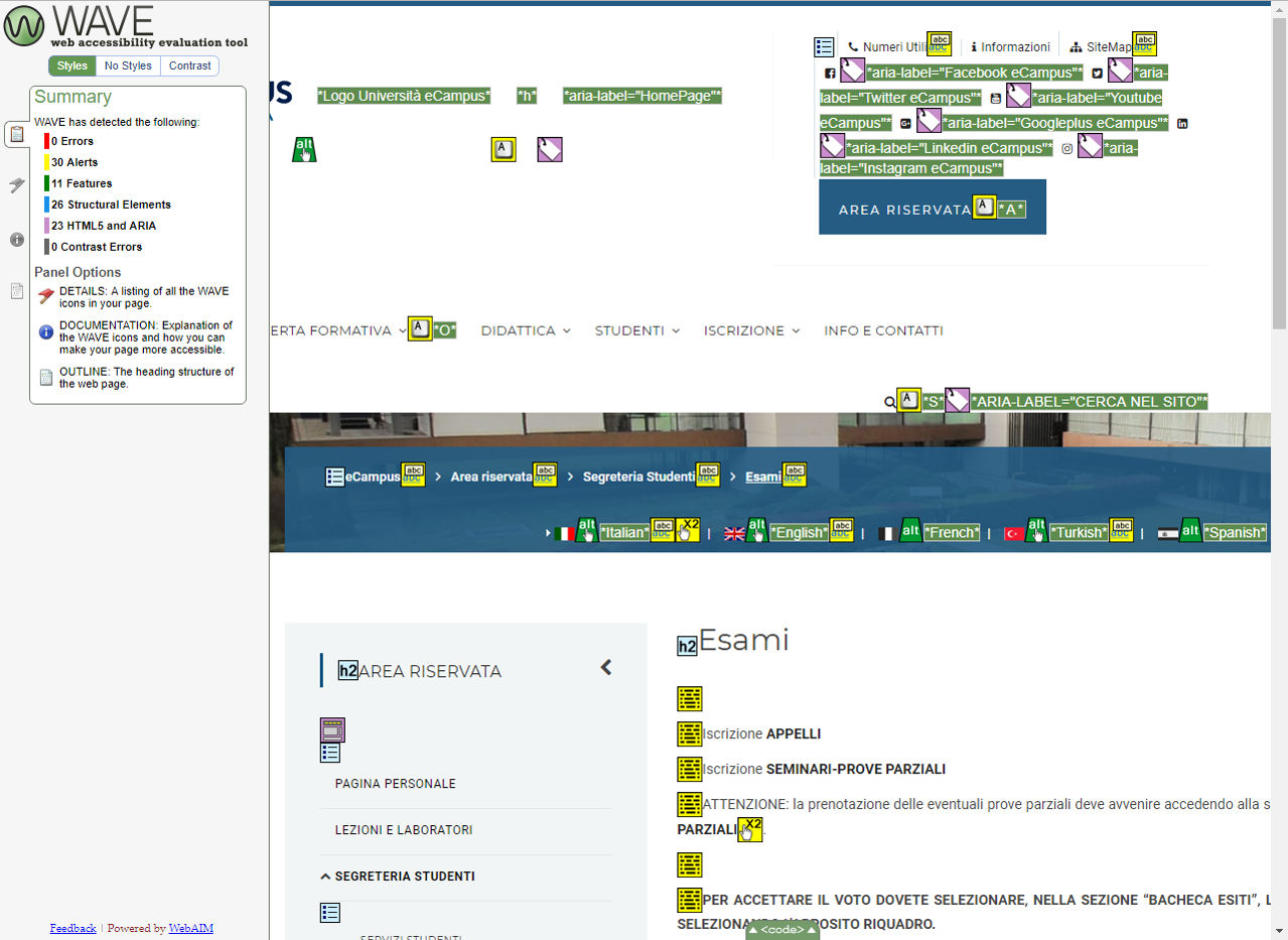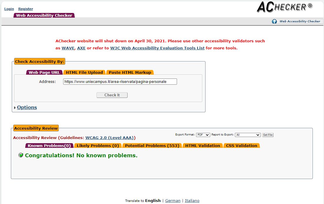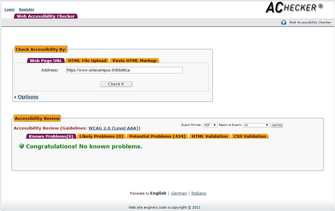 Periodicamente il portale viene sottoposto a test automatizzati di accessibilità e di usabilità (il portale è responsive, quindi fruibile anche da strumenti diversi dallo schermo del computer, quali tablet e smartphone), di cui si possono consultare di seguito i risultati.