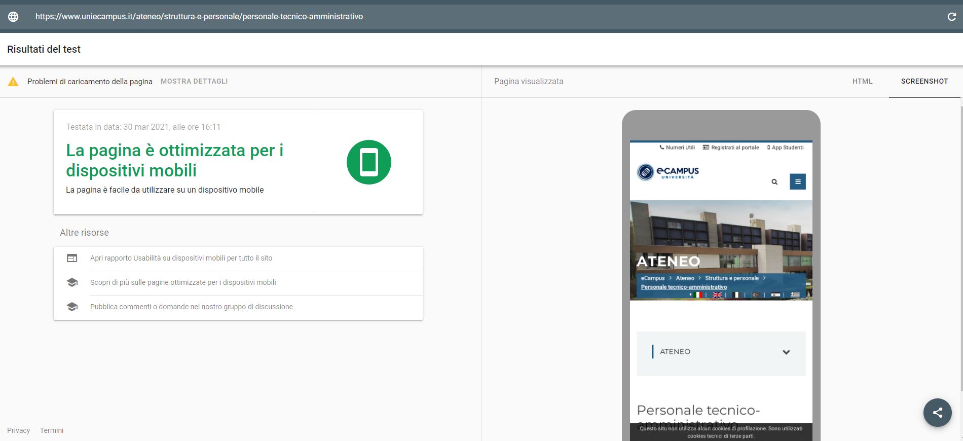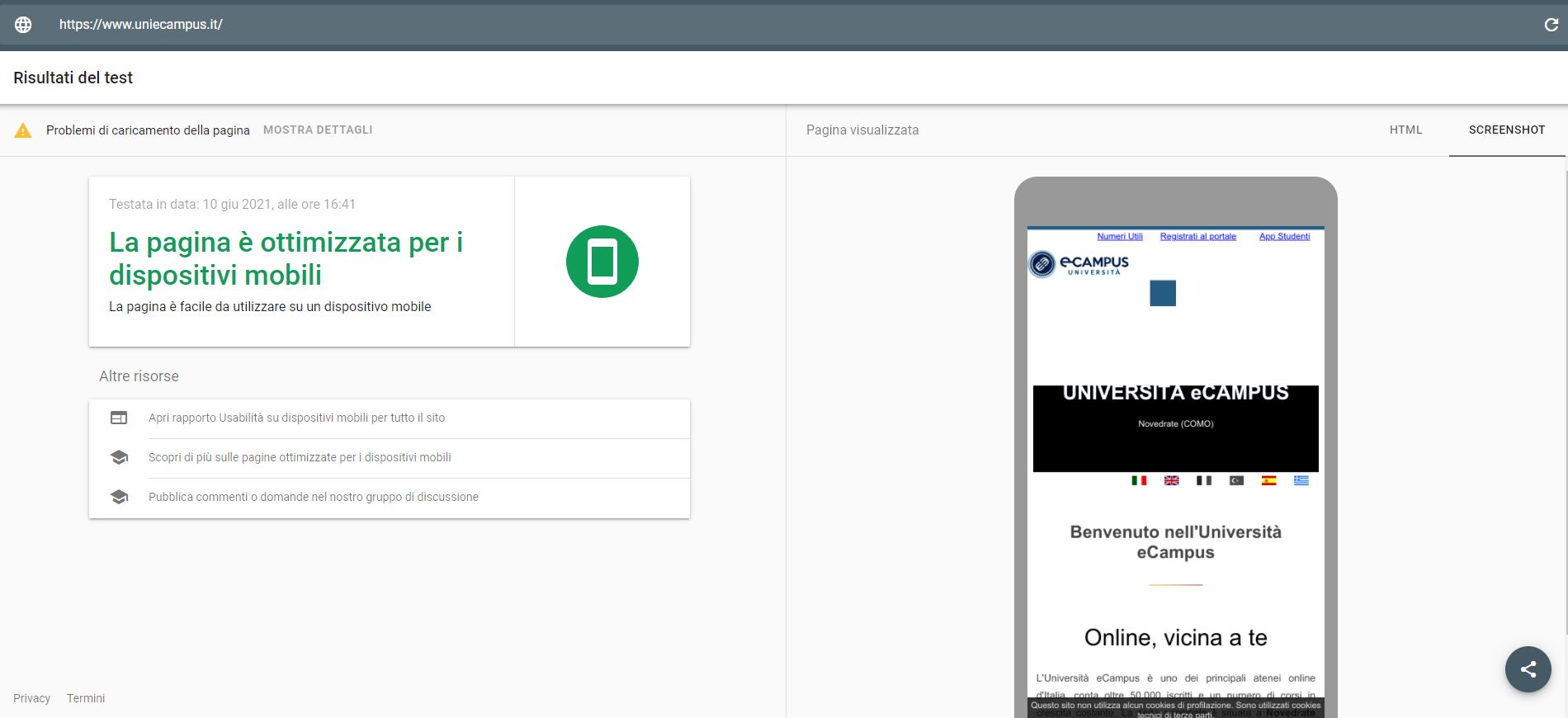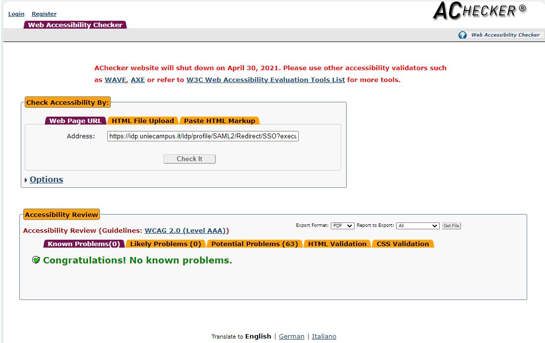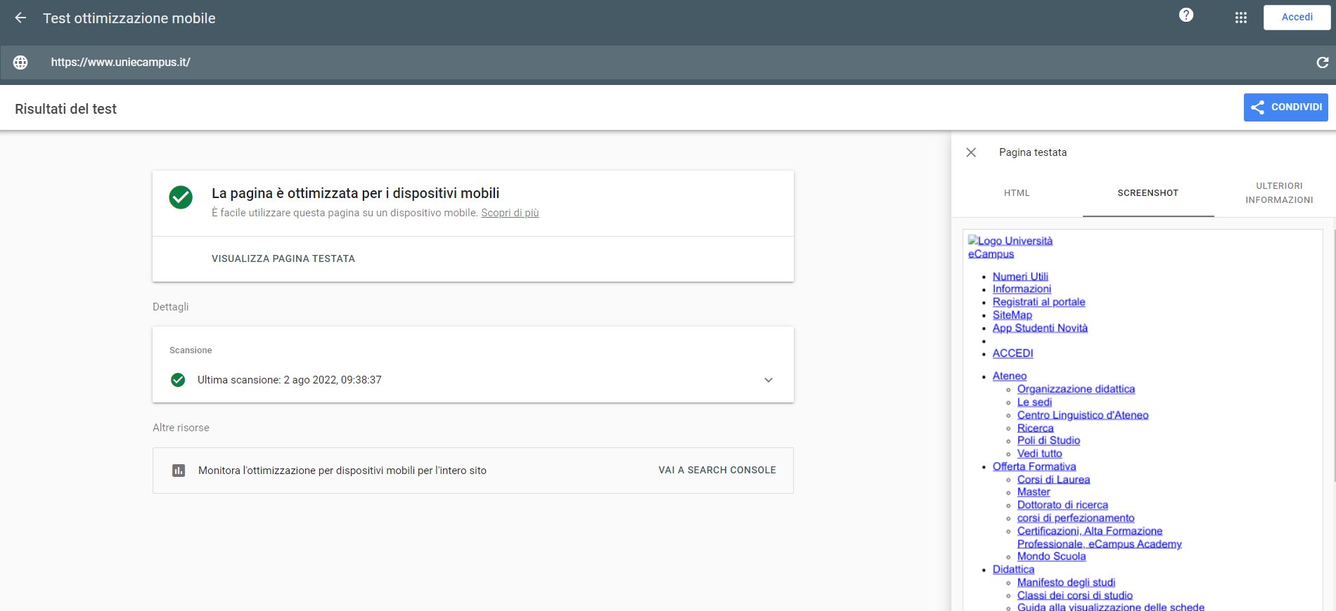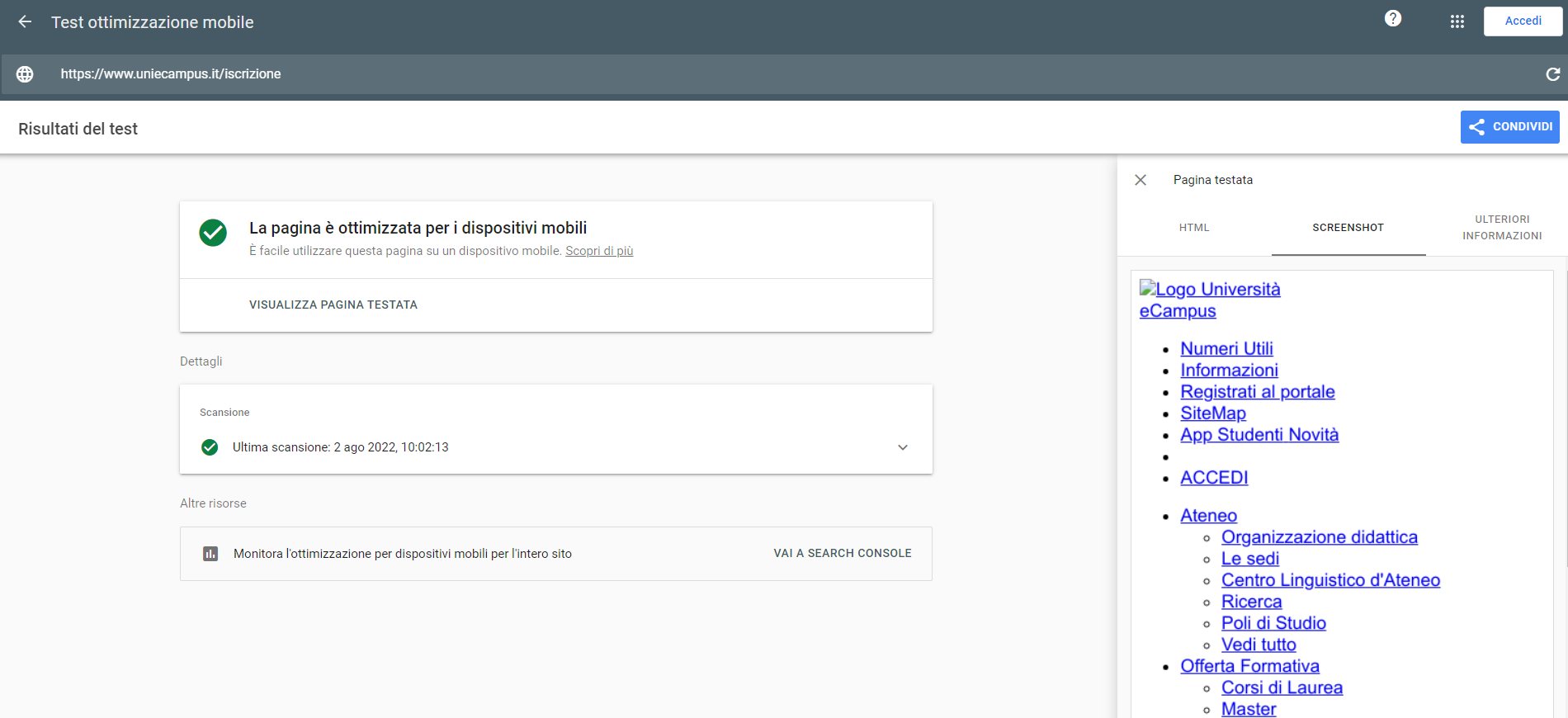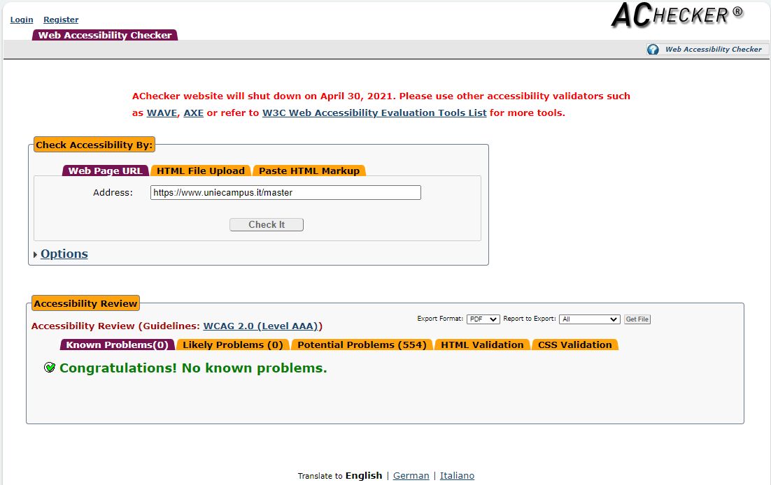 Periodicamente il portale viene sottoposto a test automatizzati di accessibilità e di usabilità (il portale è responsive, quindi fruibile anche da strumenti diversi dallo schermo del computer, quali tablet e smartphone), di cui si possono consultare di seguito i risultati.