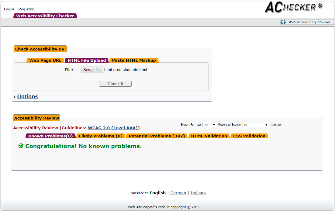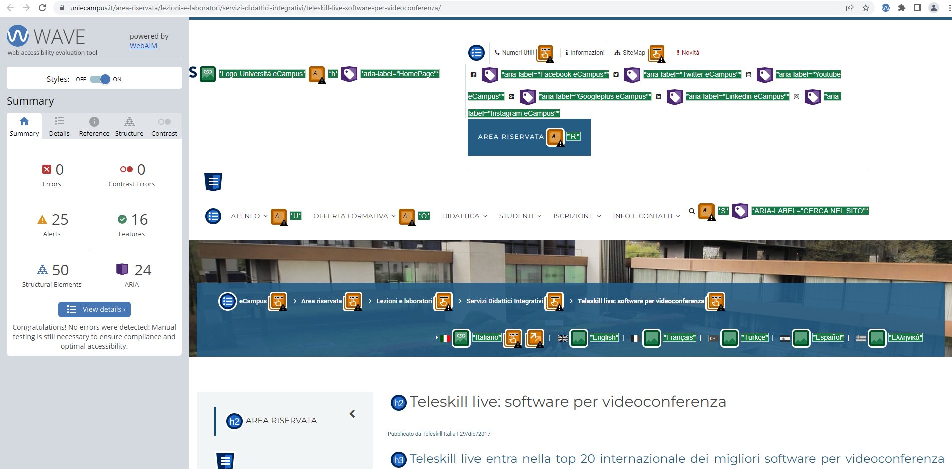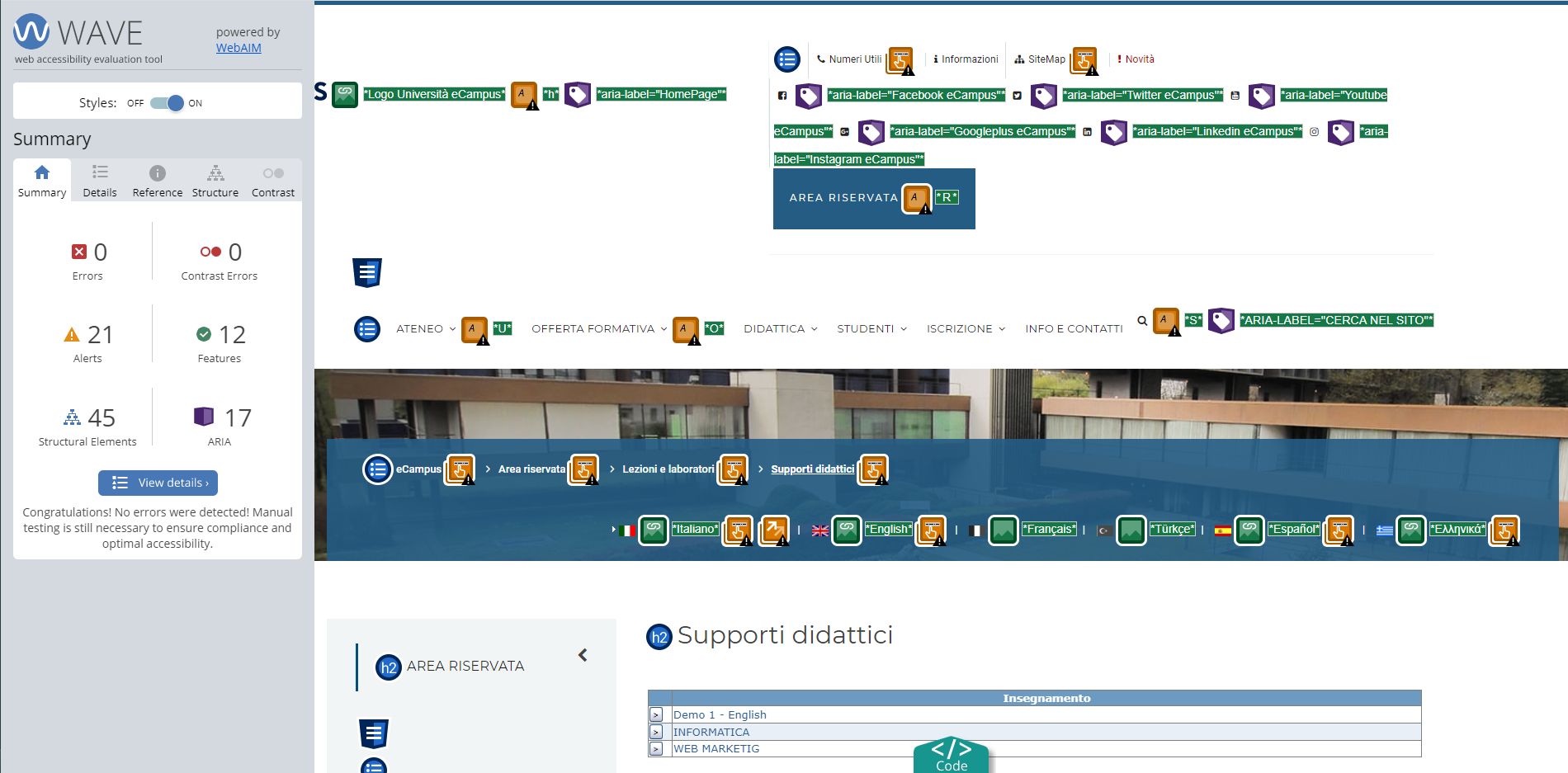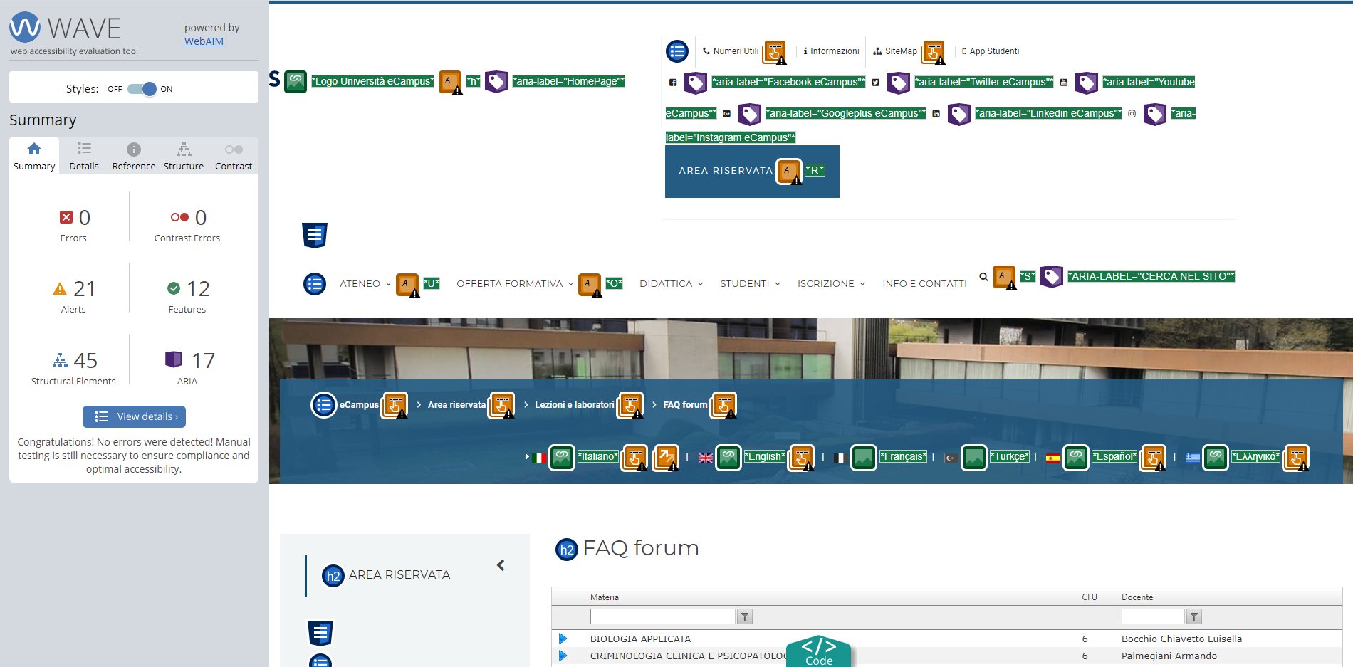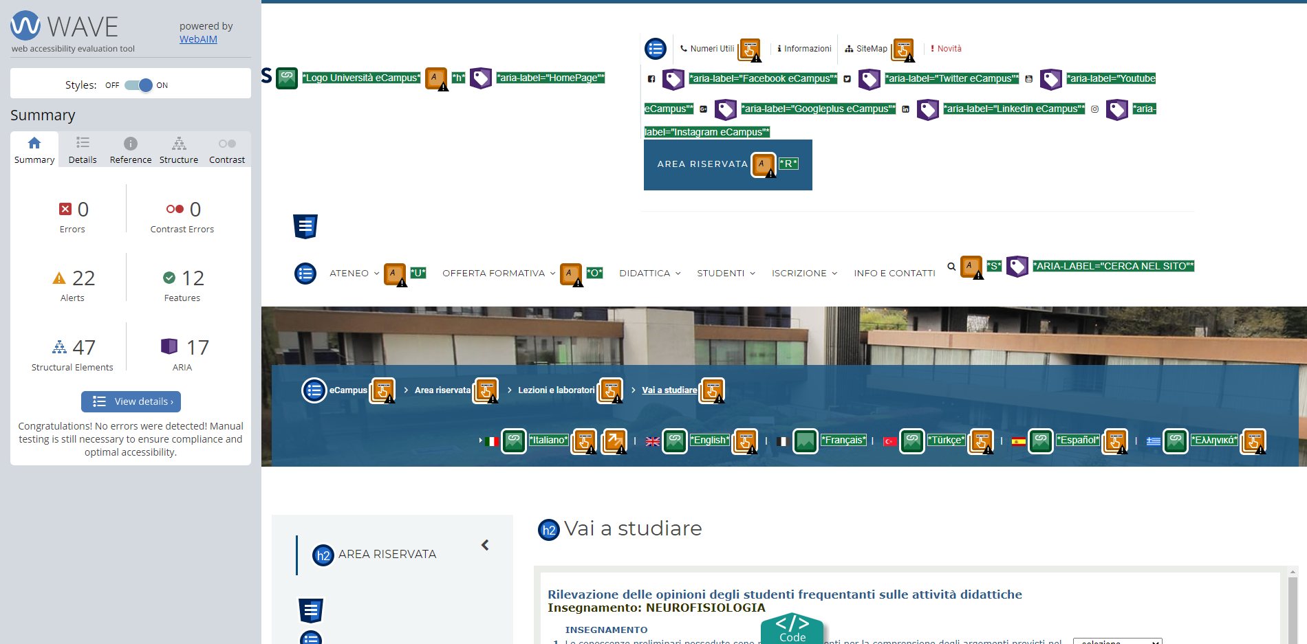 Periodicamente il portale viene sottoposto a test automatizzati di accessibilità e di usabilità (il portale è responsive, quindi fruibile anche da strumenti diversi dallo schermo del computer, quali tablet e smartphone), di cui si possono consultare di seguito i risultati.