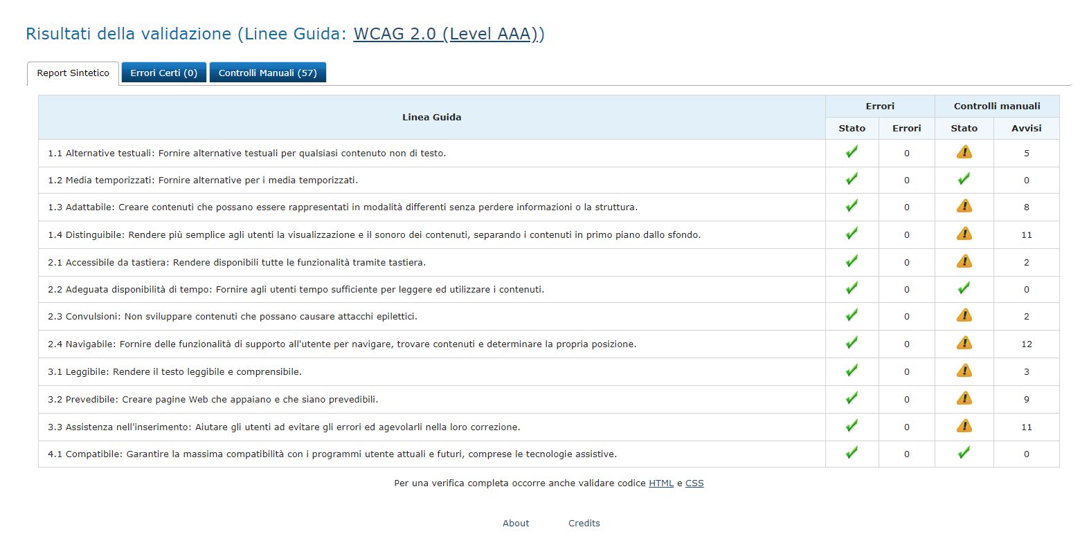 Per rendere il portale accessibile abbiamo fatto anche riferimento ai requisiti tecnici previsti nell'allegato A del Decreto ministeriale 8 luglio 2005 (aggiornato dal DM 20 marzo 2013) di attuazione della Legge 4/2004 "Disposizioni per favorire l'accesso dei soggetti disabili agli strumenti informatici", comunque aderenti alle raccomandazioni di conformità WCAG 2.0 del W3C di livello AA o superiore (WCAG2.0).